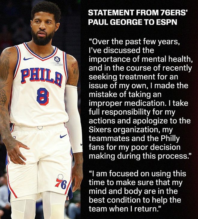 保罗乔治第一时间通过ESPN发布了一份道歉声明,主动承认错误,他在这份声明中写到:过去几年,我一直在讨论心理健康的重要性。最近这段时间,我在寻求治疗自身心理健康问题的过程中,错误地服用了不合适的药物。我愿为自己的行为承担全部责任,并向76人队、我的队友以及费城球迷道歉。我将专注于利用这段时间,确保我的身心处于最佳状态,以便在回归之后能够更好地帮助球队。