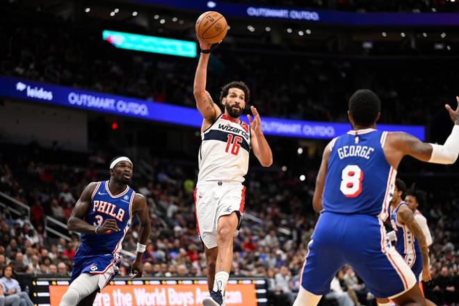 中场休息回来,奇才连续两节单节得分30+,76人进攻火力继续升级本场首次单节得分45+。76人在缠斗至80-79后,乔治与马克西继续开启得分模式,引领76人打出一波24-4攻势,76人已经扩大104-83领先优势。奇才略有反扑追分,乔治单节15分与马克西9分,引领76人单节47-32净胜15分,三节结束76人扩大120-103领先奇才。前三节比赛,76人三分24中12,乔治20中15命中6记三分狂轰39+5+6+3、马克西28+8,引领4人得分上双;奇才三分28中11,吉尔19+5+5引领5人得分上双。