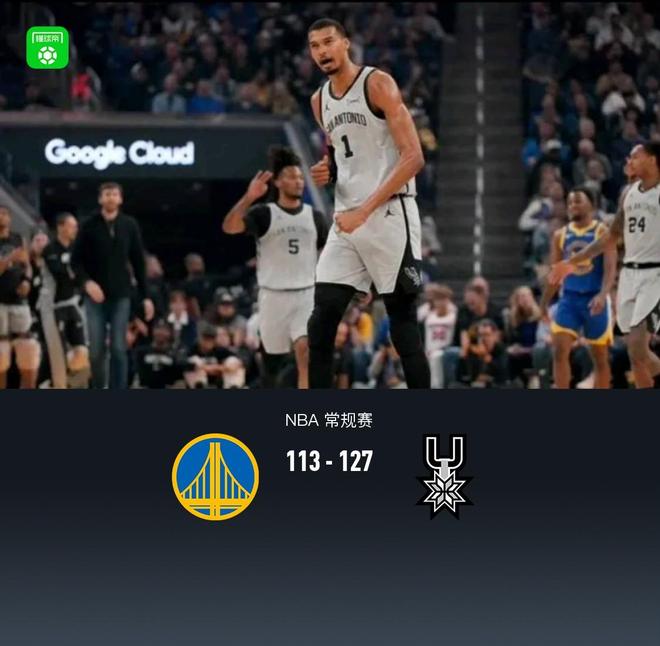 北京时间4月2日NBA 常规赛,金州勇士对阵圣安东尼奥马刺。上半场马刺文班亚马便高效轰下27分13板,半场勇士49-70马刺,第三节结束勇士一度追至13分,但末节马刺稳住局面再度拉大分差,比赛收尾勇士一波8-0缩小分差,最终马刺127-113勇士豪取10连胜。