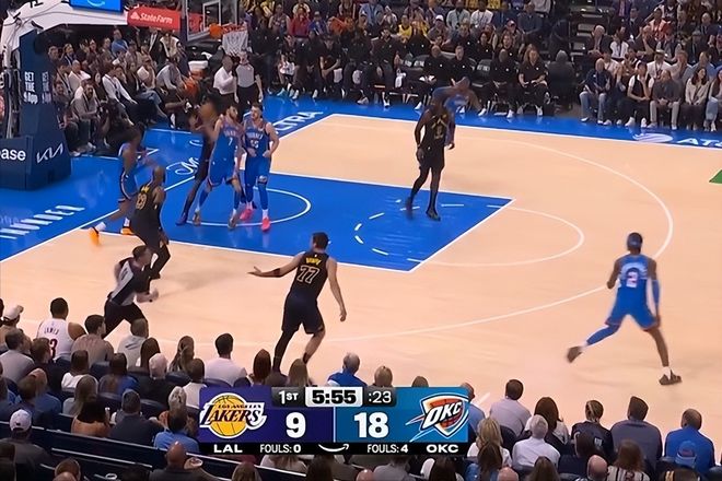 没想到的是,这场被认为是火星撞地球的比赛,一开场湖人却被全面压制。首节比赛,湖人开局就出现3个失误,里弗斯连续被抢断,雷霆3D球员多特连续命中三分球,雷迪克赶紧叫暂停。但是暂停回来之后,湖人的状态没有改观,仍然在持续失误,而且防不住雷霆队潮水般的进攻。首节12分钟,湖人出现8个失误,被对手打了7个反击,全部打成或造成犯规。
