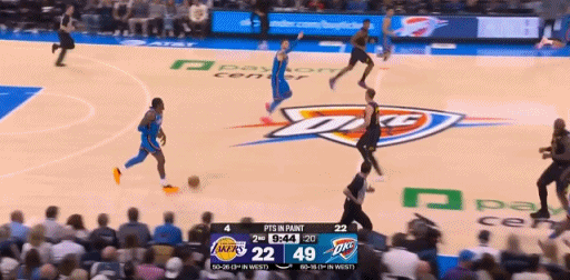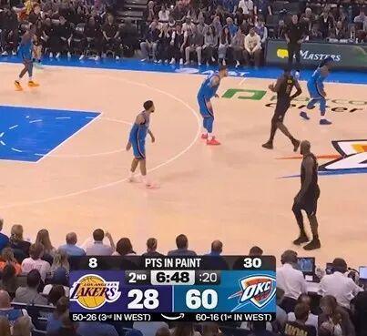一节半的时间,雷霆60-28领先了32分,光是油漆区得分30分,就比湖人所有得分28分还要多。。。