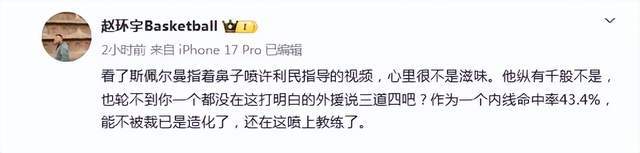 媒体人赵环宇对此发表尖锐评论,直指斯佩尔曼“配不上如此态度”:“他一个内线命中率仅43.4%、表现远未达预期的外援,能在CBA留队已是侥幸,竟敢对一位为中国女篮重振雄风立下汗马功劳的功勋教练指手画脚?”他强调,许利民曾带领中国女篮从奥运会历史最差战绩中突围,奠定世界杯亚军基石,是实至名归的中国篮球名人堂级人物。而斯佩尔曼此前在韩国联赛辗转,如今却以“被雇佣者”身份对本土功勋教练施压,令人心寒。