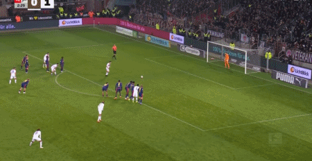 第90+3分钟,劳姆送点,卡尔斯主罚点球命中,圣保利1-1莱比锡
