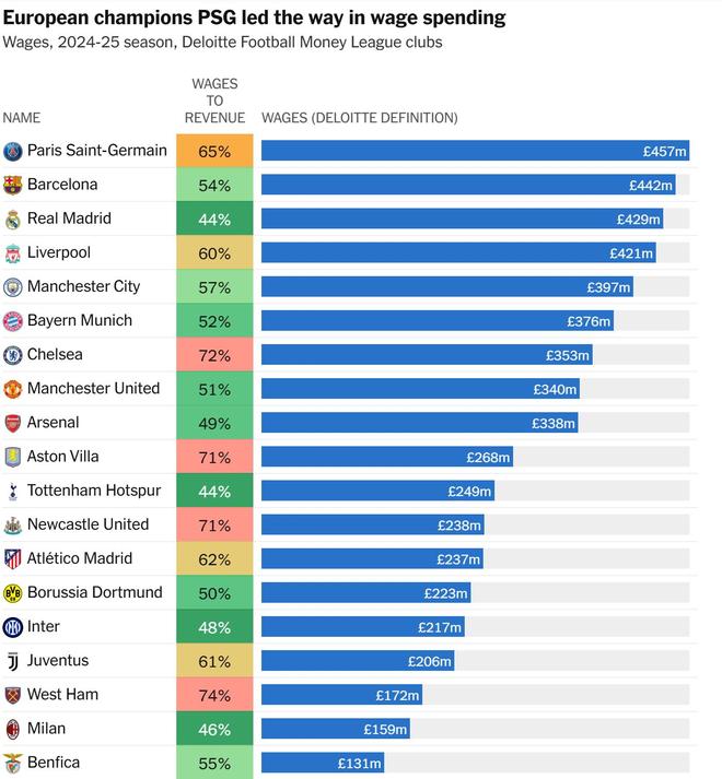 在这11家俱乐部中,只有阿森纳、曼联、桑德兰,或许还有曼城,可以声称因为去年夏天的引援而变得更强大。热刺、诺丁汉森林和西汉姆联都在为保级而战。在工资方面,英超俱乐部也占据了支出最高名单的主导地位。